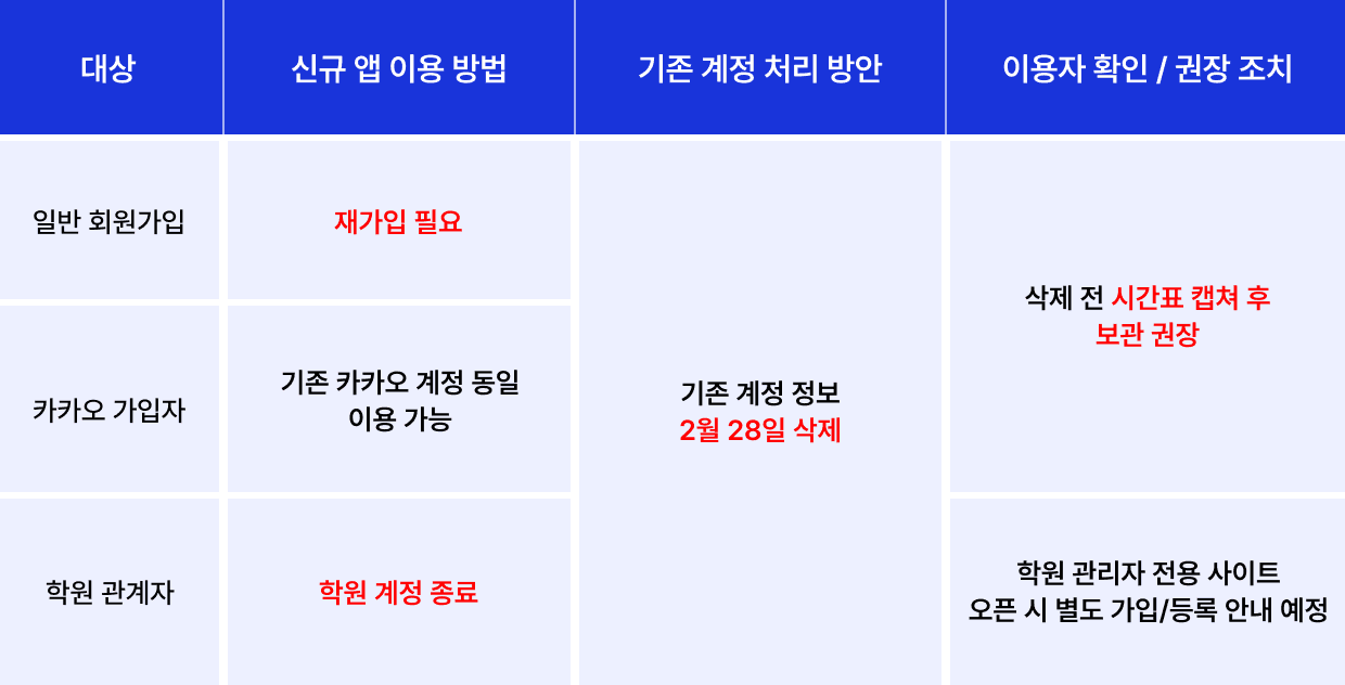 신규 앱 런칭에 따라 로그인 방식 및 일부 데이터 처리 기준이 변경됩니다. 아래 내용을 꼭 확인해 주세요.